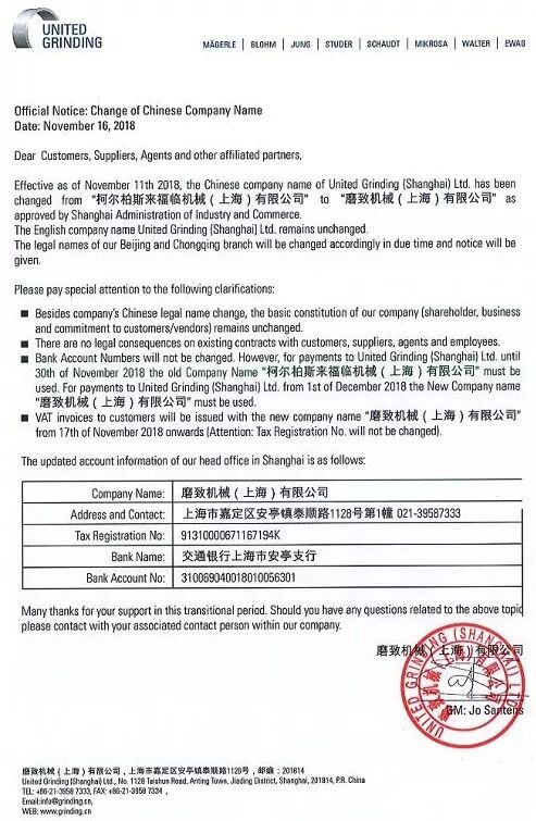 4. 自2018年11月17日起,我司增值税发票将以新的公司名称:磨致机械(上海)有限公司,出具给客户。(请注意:税务登记证号码将保持不变)